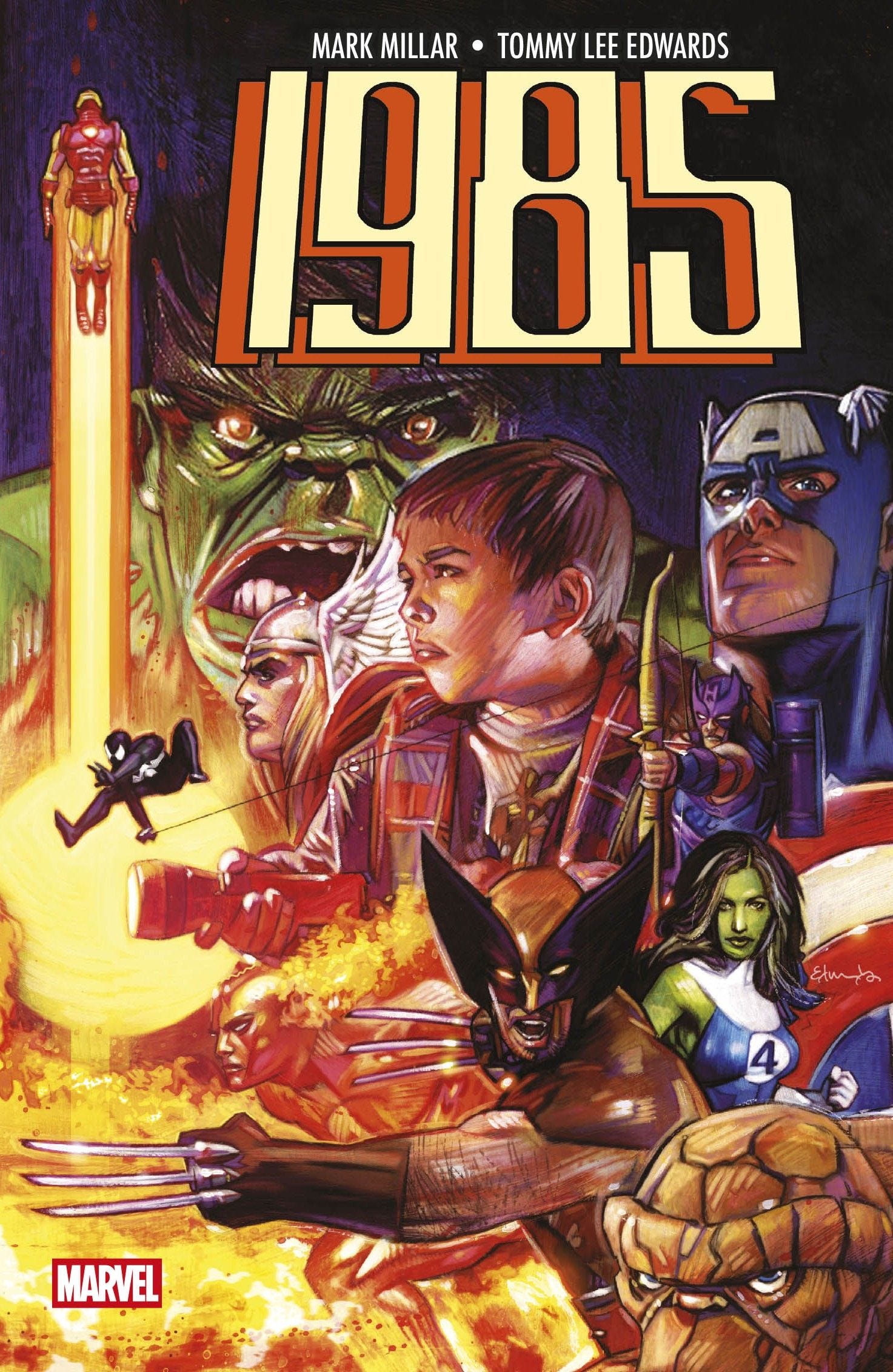 Antes de "Vengadores Desunidos", antes de Civil War, antes de Miedo Encarnado, el más poderoso grupo de supervillanos del Universo Marvel desató el caos en un lugar en el que nunca habían estado antes: ¡Nuestro propio mundo! El destino del planeta descansa en las manos de Toby, un chaval de trece años loco por los cómics de Marvel. Las superestrellas Mark Millar (Civil War, Los 4 Fantásticos) y Tommy Lee Edwards (Bullet Points) desatan la epopeya que nunca esperarías leer y que podrías haber protagonizado tú mismo. 1985 es un relato nostálgico que apela a los niños que un día descubrieron, a través de los cómics, que el mundo podría llegar a ser un lugar fascinante.
